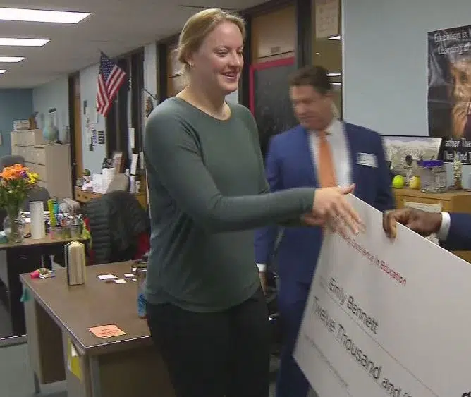 Emily Bennett was surprised with a $12,000 check Thursday from the Voya Unsung Heroes Awards to fund a hydroponics lab for her students.