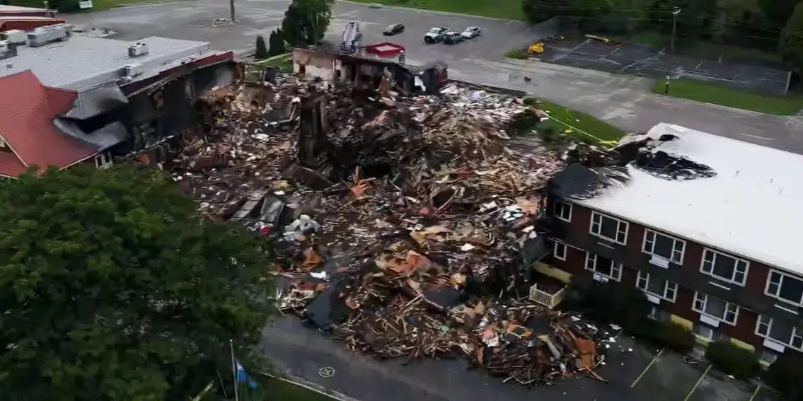 The remains of a building on the Rowleys Bay Resort property in Door County are seen Sept. 6, 2023, one day after a fire. PC: Fox 11 Online