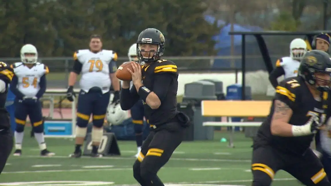 (WNFL) – WAUWATOSA – St. Norbert College couldn’t hold a fourth-quarter lead and gave up two late touchdowns as Monmouth College escaped with a 21-14 win over the Green Knights in the Cousins Subs Lakefront Bowl at Raabe Stadium.The Green Knights (7-4) held a 14-7 lead going to the fourth quarter and stopped Monmouth on downs near midfield early in the frame. The Green Knights drove to Monmouth 19 and had a second-and-2 turn into a fourth-and-8 after a loss and penalty and an interception in the end zone stopped the drive. Both teams traded possessions until Monmouth took over at its own 3-yard line with 5:18 left.Monmouth completed a 51-yard pass from Carter Boyer to Nate Thornton to get out of the hole and advanced to a fourth-and-2 at the St. Norbert 20. Boyer then got loose on the play for a 20-yard touchdown to tie the game with 2:50 left. St. Norbert got the ball back and got to its own 34 but lost the ball on a strip sack, with Monmouth recovering at the Green Knights’ 28. Three plays later Boyer hit Thornton on a 17-yard touchdown with 34 seconds remaining.St. Norbert got the first half’s lone points when Peyton Lyon’s quarterback sneak with 2:05 left in the second quarter capped off a long drive for a 7-0 lead.The Green Knights then pulled ahead 14-0 on their first possession of the third quarter when Peyton Lyon hit Tommy Hoeft from eight yards out. The Scots answered after a long pass set up Monmouth deep in St. Norbert territory, with Boyer scoring on a keeper with 7:56 left in the third quarter to cut it to 14-7.Monmouth outgained St. Norbert 329-253 in total offense. Owen Kudick finished with 127 rushing yards on 18 attempts to lead the Green Knights.Boyer completed 14 of 27 passes for 257 yards for Monmouth, which had just 72 rushing yards on 34 attempts.Sam Barnett and Justin Benoit each had seven tackles to lead St. Norbert, while Kyle Santos had six stops and two tackles-for-loss