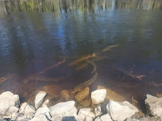 Lake sturgeon usually spawn when water temperatures reach about 53 degrees Fahrenheit. However, when water levels are low (like this year), they might not start spawning until water temperatures are closer to 60 degrees. The current water temperatures in the system are hovering around 50 degrees Fahrenheit.