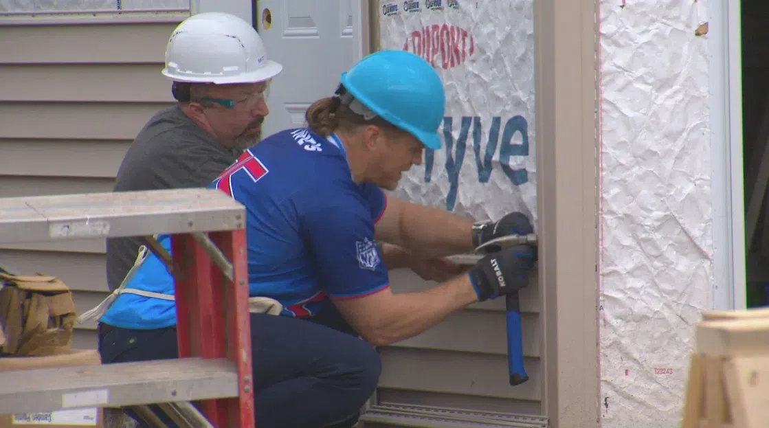 Former Packers player Clay Matthews volunteers withHabitat for Humanity of Greater Green Bay on a home build during NFL Draft week, April 24, 2025. PC: Fox 11 Online
