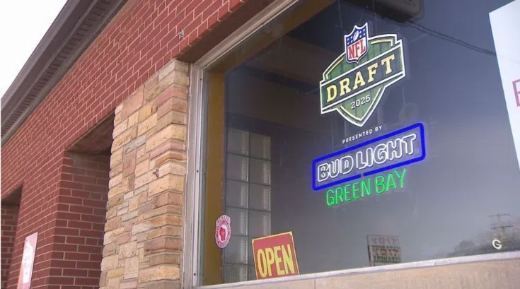 An NFL Draft neon sign sits in the window of a Wisconsin Tavern League bar in downtown Green Bay on April 4, 2025. PC: Fox 11 Online