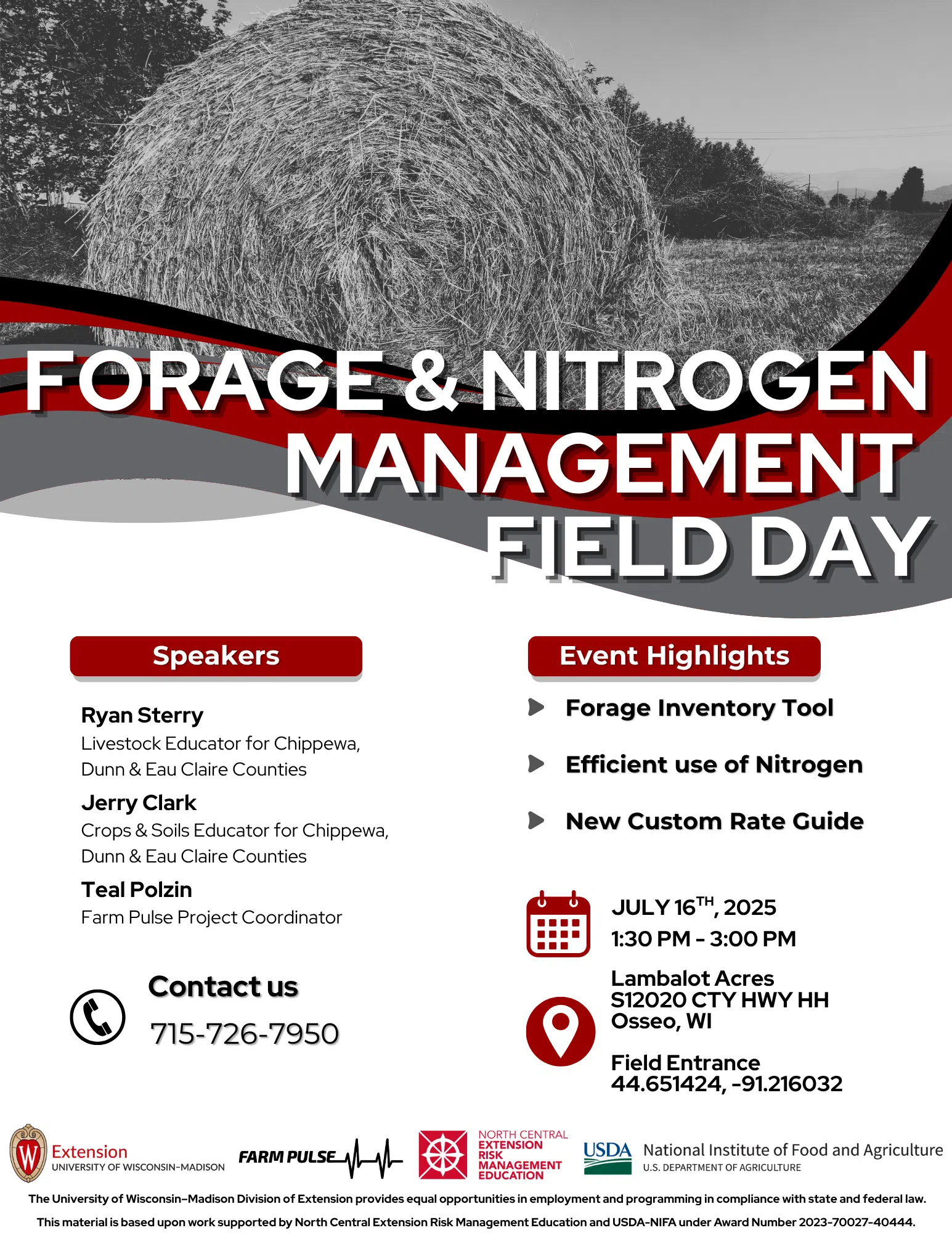 Osseo, WI – Farmers and agricultural professionals are invited to attend a free Forage & Nitrogen Management Field Day on Tuesday, July 16, 2025, from 1:30 PM to 3:00 PM at Lambalot Acres, located at S12020 County Highway HH, Osseo, WI.