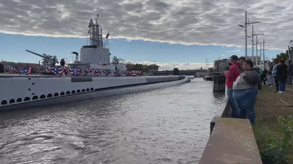 Spectators watch as the USS Cobia returns to the Wisconsin Maritime Museum in Manitowoc Oct. 15, 2025. PC: Fox 11 Online