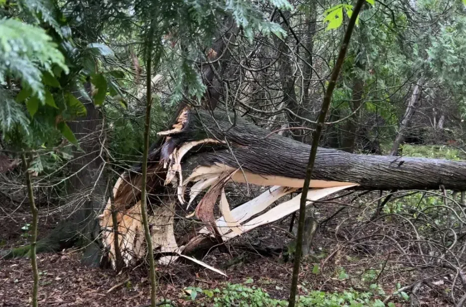 A snapped tree in Door County following strong storms on August 9, 2025. PC: Fox 11 Online